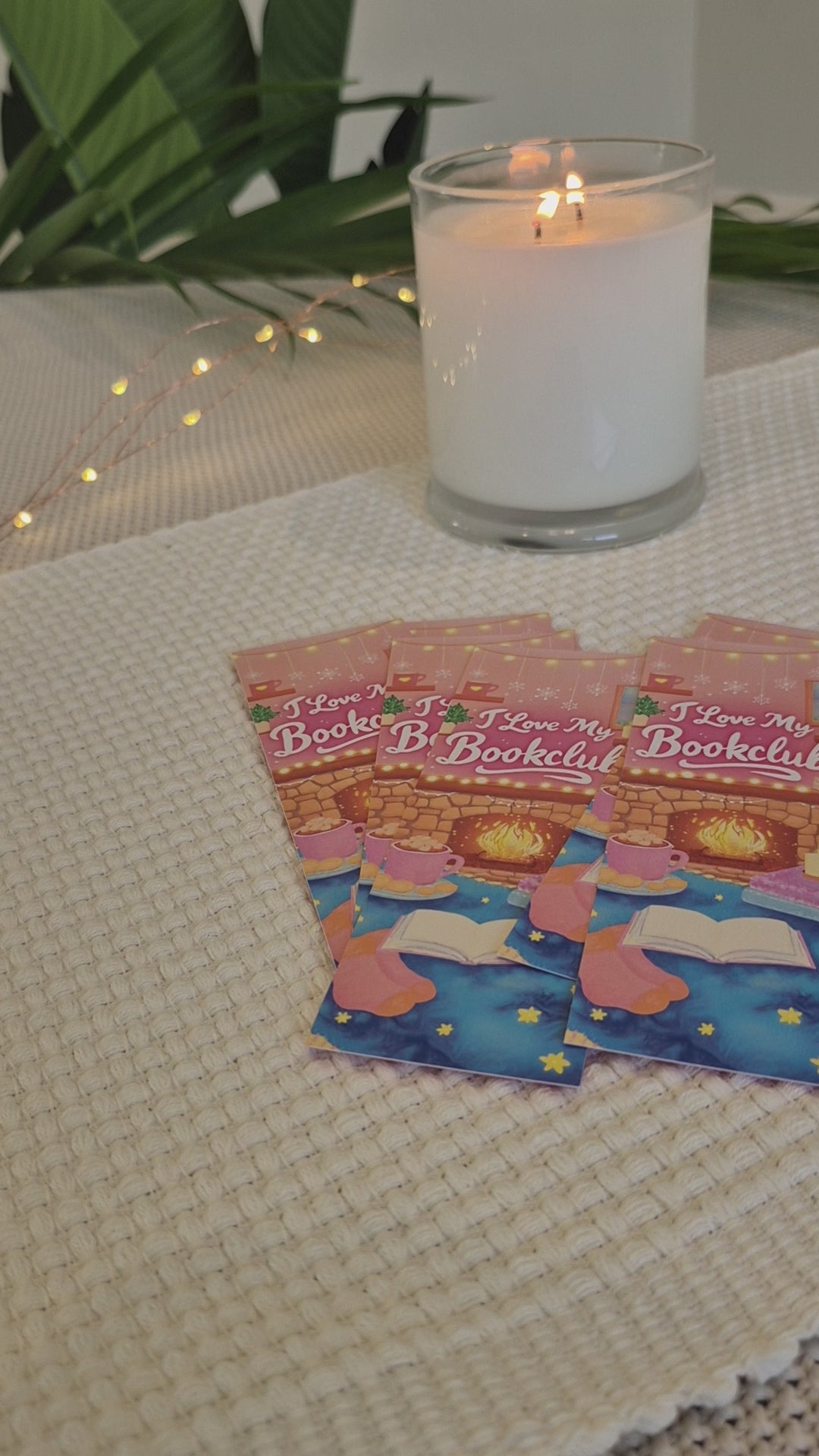 The front design features a glowing fireplace, fairy lights, stacked books, candles, hot chocolate, and an open book resting in the warmth. It captures that lovely feeling of a quiet winter reading moment, wrapped in comfort and calm.